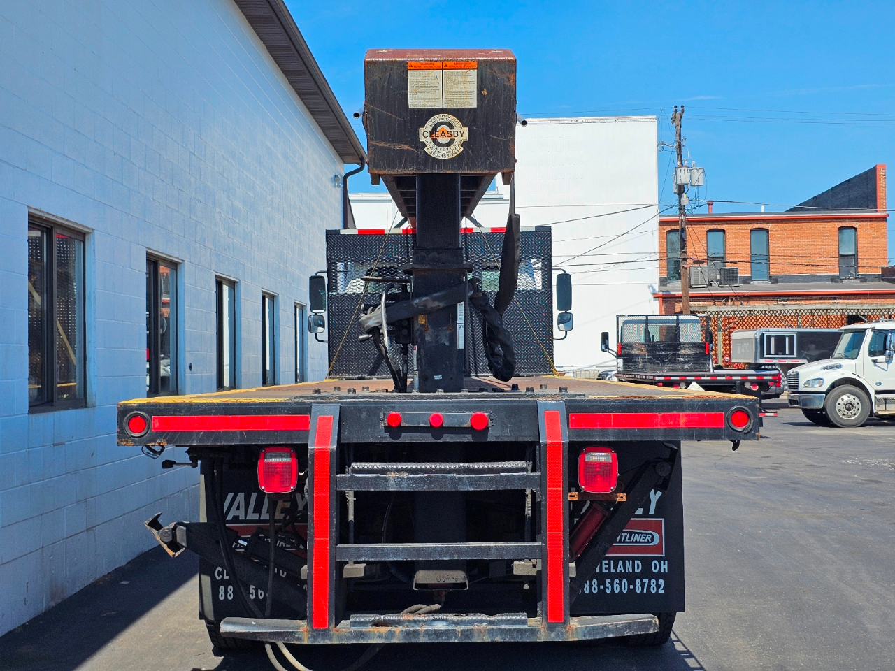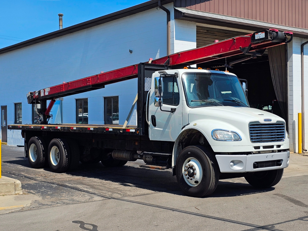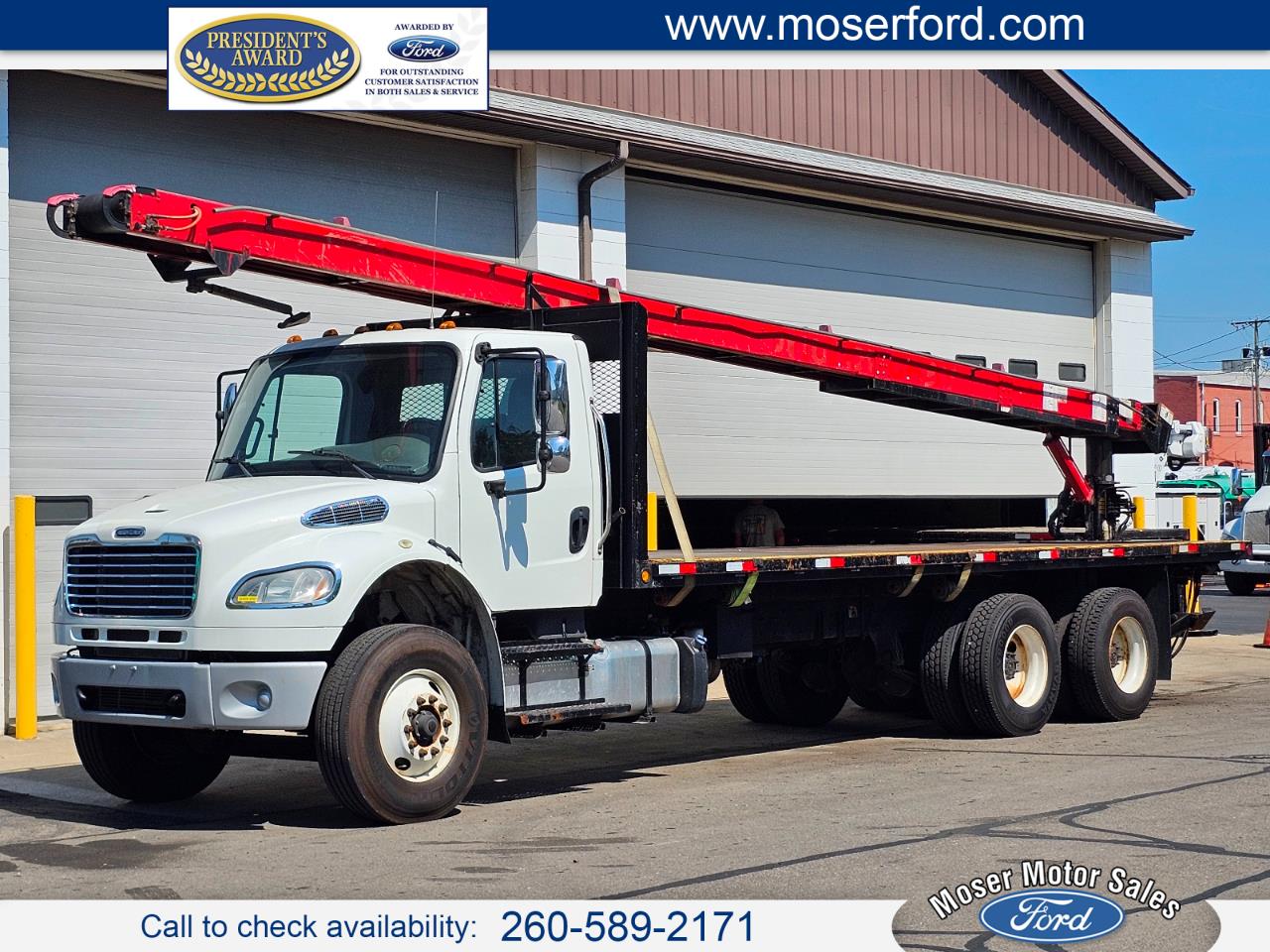 UH906. 2014 Freightliner M2 106. 56K GVWR. 143K miles. 8.9 liter Cummins ISL; 350hp. Allison RDS3000 automatic transmission. Rear locking differentials. Rear air ride. 200" CA on 266" wheelbase. Genweld 26' flatbed. 96"w rubrail - rubrail, 61" bulkhead, treadplate steel floor, stake pockets in rubrail, LH winch track, 8" long sills, 4" structural x-members on 10" centers. Cleasby shingle conveyor model FBR-6-38, rear outriggers. Price includes DOT inspection and 45 day plates. Commercial financing for qualified applicants and 48 state delivery available. Photos taken prior to service and reconditioning.